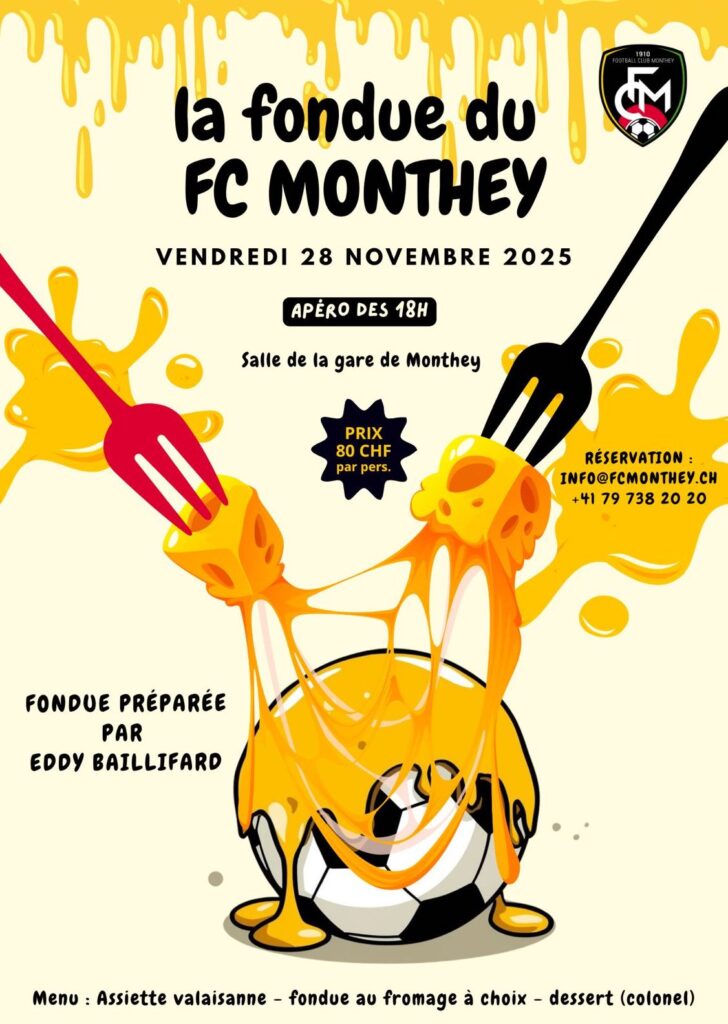 EvènementsSoirée Fondue du FC Monthey !il y a 5 joursLe Rendez-vous Incontournable Réservations : E-Mail: info@fcmonthey.ch : +41 79 738 20 20